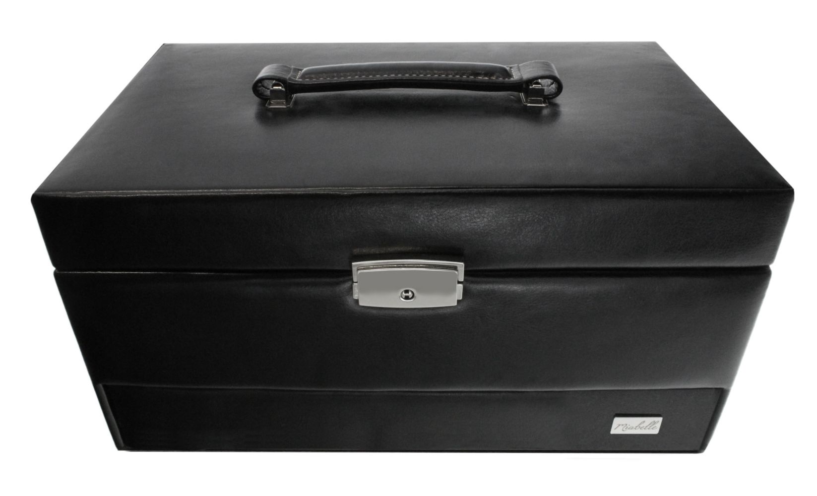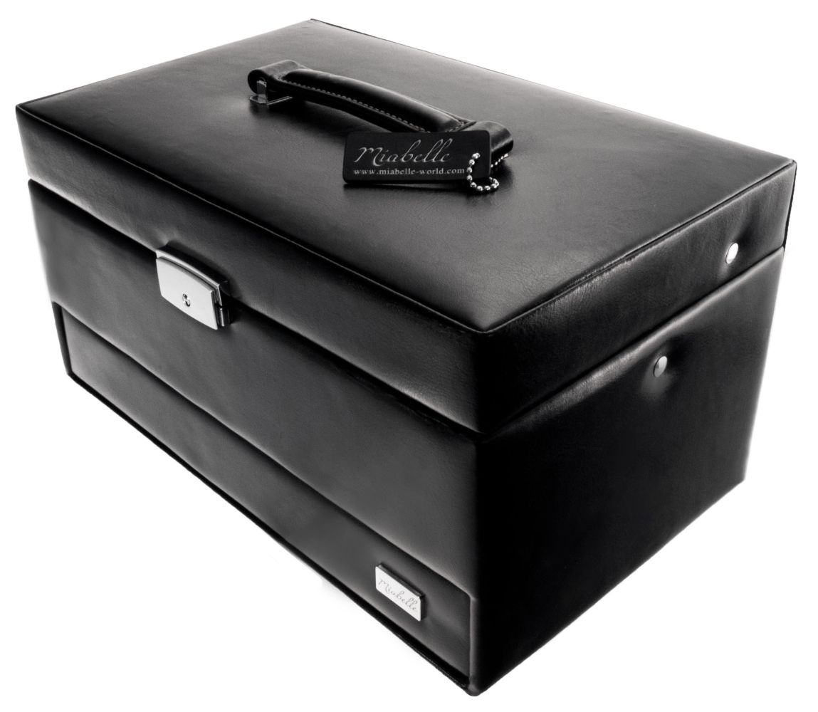 Diese Miabelle Schmuckschatulle ist auch der größten Schmucksammlung gewachsen. Auf insgesamt drei Etagen bietet sie genug Platz für alle Arten von Schmuck. Beim Öffnen der Schatulle klappt die obere Etage automatisch nach oben und Sie haben direkt einen Überblick über Ihre Schmucksammlung. In der oberen Etage befinden sich mehrere kleine Fächer sowie Steckfächer für bis zu sieben Ringe. Ein weiteres Fach wird mit einer Abdeckung geschützt, sodass Sie hier wertvolle Schmuckstücke verbergen können. In der zweiten Etage befindet sich ein großes Fach mit vier kleineren und zwei größeren Kästchen. In der dritten Etage befindet sich eine Schublade, die Sie auch öffnen können, ohne die Schatulle vorher aufgeschlossen zu haben. Sie eignet sich hervorragend für Dokumente oder Schmuckstücke, die Sie schnell erreichen müssen. In der Schublade, die sich mühelos öffnen lässt, befindet sich darüber hinaus noch ein herausnehmbares Etui. Dank diesem müssen Sie unterwegs nicht mehr auf Ihre Lieblingsstücke verzichten. Die Schatulle ist in grauem Velours ausgekleidet. Das Obermaterial glänzt in edlem schwarz und ist besonders pflegeleicht. Ein Schatz für Ihre Schätze. Überzeugen Sie sich selbst.