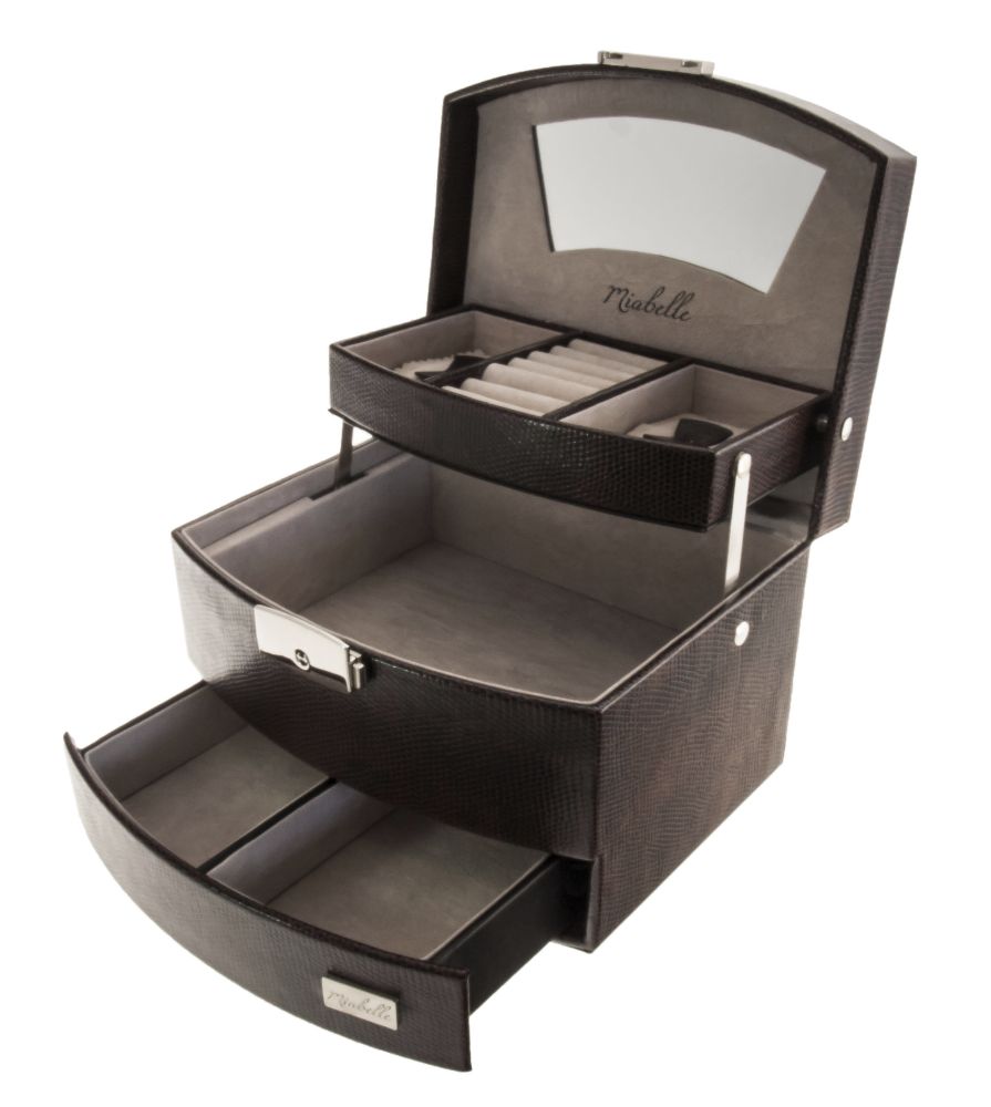 Une boîte à bijoux de Miabelle qui assure une protection optimale. Un gros volume de rangement la rend très pratique, idéal pour tous les objets précieux. C’est un accessoire pratique et élégant aux formes et couleurs modernes. Trois étages vous permettent de protéger efficacement tous vos bijoux. Le premier étage dispose de deux emplacements et d'encoches pour près de douze bagues. Au-dessous, vous trouverez un espace spacieux pour des bijoux de plus grande envergure. Le tiroir du dessous est idéal pour vos autres accessoires. L'intégralité de la partie intérieure est en velours afin de protéger au maximum tous vos accessoires contre les rayures et la poussière. La boîte à bijoux Miabelle dispose d'une fermeture par clé. Les matériaux choisis sont très facile d’entretien et d’une brillance indéniable. Savourez les plaisirs de ce coffret bijoux.